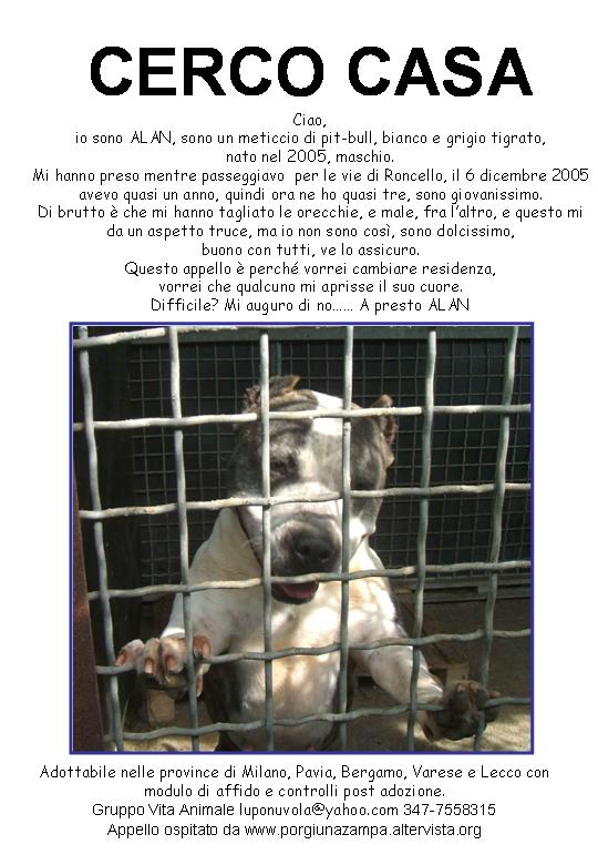 io sono ALAN, sono un meticcio di pit-bull, bianco e grigio tigrato, nato nel 2005, maschio.